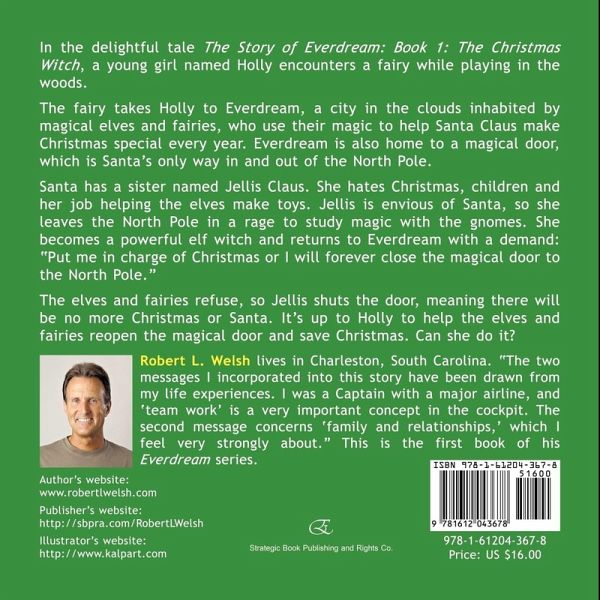 In the delightful tale The Story of Everdream: Book 1: The Christmas Witch, a young girl named Holly encounters a fairy while playing in the woods. The fairy takes Holly to Everdream, a city in the clouds inhabited by magical elves and fairies, who use their magic to help Santa Claus make Christmas special every year. Everdream is also home to a magical door, which is Santa's only way in and out of the North Pole. Santa has a sister named Jellis Claus. She hates Christmas, children, and her job helping the elves make toys. Jellis is envious of Santa, so she leaves the North Pole in a rage to study magic with the gnomes. She becomes a powerful elf witch and returns to Everdream with a demand: "Put me in charge of Christmas or I will forever close the magical door to the North Pole." The elves and fairies refuse, so Jellis shuts the door, meaning there will be no more Christmas or Santa. It's up to Holly to help the elves and fairies reopen the magical door and save Christmas. Can she do it? Robert L. Welsh lives in Charleston, South Carolina. "The two messages I incorporated into this story have been drawn from my life experiences. I was a Captain with a major airline, and 'team work' is a very important concept in the cockpit. The second message concerns 'family and relationships,' which I feel very strongly about." This is the first book of his Everdream series.