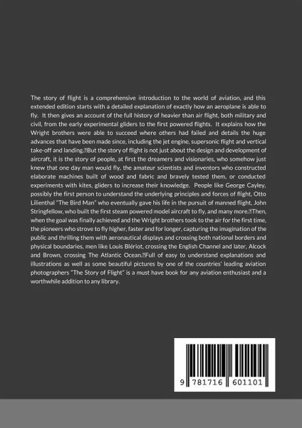The story of flight is a comprehensive introduction to the world of aviation and starts with a detailed explanation of exactly how an aeroplane is able to fly. It then gives an account of the full history of heavier than air flight, both military and civil, from the early experimental gliders to the first powered flights. It explains how the Wright brothers were able to succeed where others had failed and details the huge advances that have been made since, including the jet engine, supersonic flight and vertical take-off and landing. But the story of flight is not just about the design and development of aircraft, it is the story of people, at first the dreamers and visionaries, who somehow just knew that one day man would take to the skies, the amateur scientists and inventors who constructed elaborate machines built of wood and fabric and bravely tested them, or conducted experiments with kites, gliders and primitive wind tunnels to gain data that could later be analysed to increase their knowledge. People like George Cayley, who may have been the first person to understand the underlying principles and forces of flight, Otto Lilienthal "The Bird Man" who eventually gave his life in the pursuit of manned flight, John Stringfellow, who built the first steam powered model aircraft to fly, and many more. Then, when the goal was finally achieved and the Wright brothers took to the air for the first time, the pioneers who strove to fly higher, faster and for longer, capturing the imagination of the public and thrilling them with aeronautical displays and crossing both national borders and physical boundaries, men like Louis Blériot who was the first to cross the English Channel and later, Alcock and Brown, crossing not just channels but continents and oceans. Full of easy to understand explanations and illustrations as well as some beautiful pictures by one of the countries' leading aviation photographers "The Story of Flight" is a must have book for any aviation enthusiast and a worthwhile addition to any reference library.