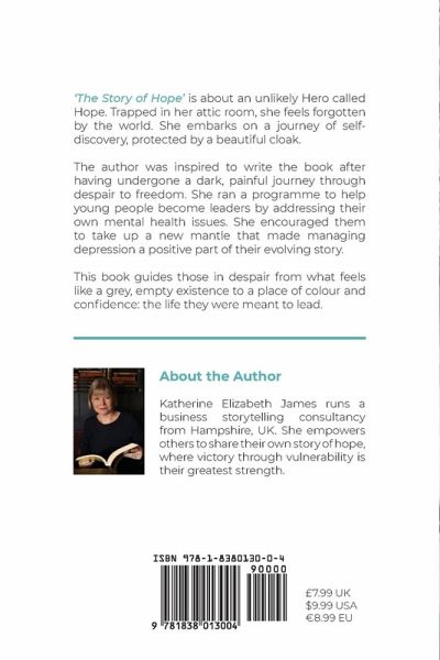 The author, Katherine Elizabeth James runs a business storytelling consultancy from Hampshire in the UK. Katherine has a heart for helping those struggling with mental health problems having fought her own painful battle with depression. A shy, sensitive child, she spent many hours in the attic of the large house by the sea where she grew up, trying to make sense of the world. She fed her imagination with fairy tales and fantasy literature like the Hobbit, Wizard of Oz and Alice and Wonderland. Feeling like an undiscovered Princess, the idea of 'The Story of Hope' was born. The Heroes and Heroines of those tales became her friends. Later, working with young people with mental health issues, she saw how they often retreated into their own 'attic' of despair, hiding away from the world. She realised that we are all on a Hero's Journey, called to find hope by conquering adversity. Now Katherine uses storytelling to help others navigate uncertainty on their own personal journey of self-discovery. Through her work and her writing, Katherine empowers others to share their own story of hope, where victory through vulnerability is their greatest strength.
