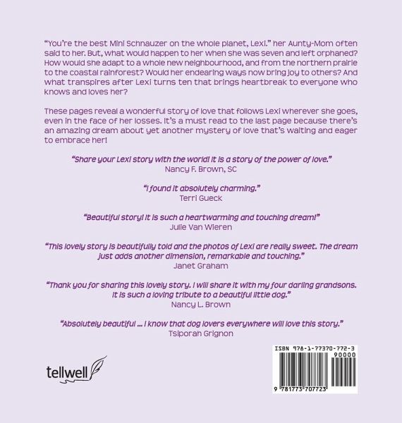 "You're the best Mini Schnauzer on the whole planet, Lexi." her Aunty-Mom often said to her. But, what would happen to her when she was seven and left orphaned? How would she adapt to a whole new neighborhood, and from the northern prairie to the coastal rainforest? Would her endearing ways now bring joy to others? And then what transpires one weekend, a few months after Lexi turned ten, bringing heartbreak to everyone who knew her? These pages reveal a precious story of love that follows Lexi wherever she goes, even in the face of her losses. It's a must read to the last page because there's an amazing dream about another mystery of love that's waiting and eager to embrace her!