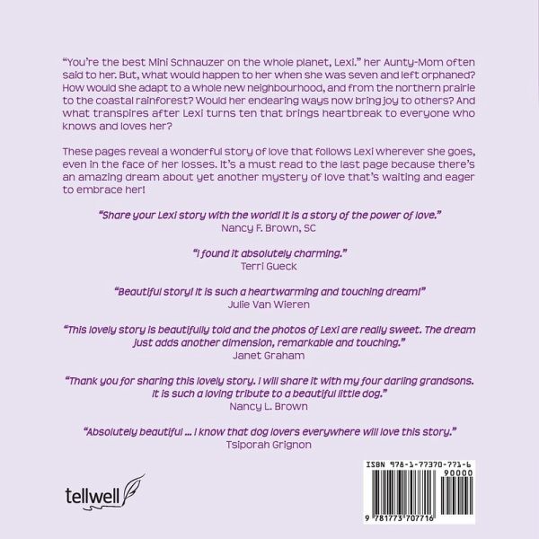 "You're the best Mini Schnauzer on the whole planet, Lexi." her Aunty-Mom often said to her. But, what would happen to her when she was seven and left orphaned? How would she adapt to a whole new neighborhood, and from the northern prairie to the coastal rainforest? Would her endearing ways now bring joy to others? And then what transpires one weekend, a few months after Lexi turned ten, bringing heartbreak to everyone who knew her? These pages reveal a precious story of love that follows Lexi wherever she goes, even in the face of her losses. It's a must read to the last page because there's an amazing dream about another mystery of love that's waiting and eager to embrace her!