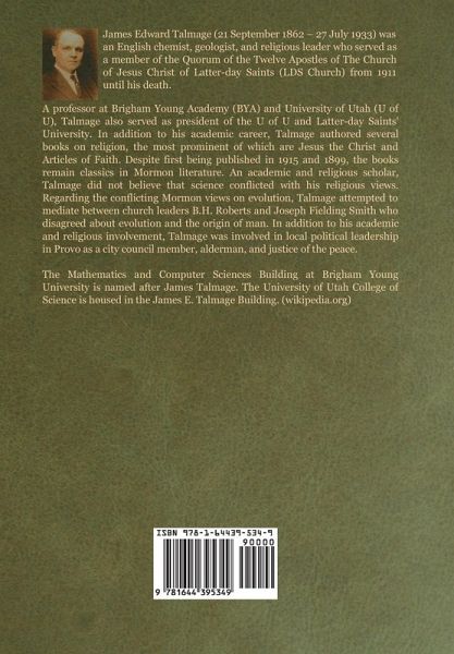 James Edward Talmage (21 September 1862 - 27 July 1933) was an English chemist, geologist, and religious leader who served as a member of the Quorum of the Twelve Apostles of The Church of Jesus Christ of Latter-day Saints (LDS Church) from 1911 until his death. A professor at Brigham Young Academy (BYA) and University of Utah (U of U), Talmage also served as president of the U of U and Latter-day Saints' University. In addition to his academic career, Talmage authored several books on religion, the most prominent of which are Jesus the Christ and Articles of Faith. Despite first being published in 1915 and 1899, the books remain classics in Mormon literature. An academic and religious scholar, Talmage did not believe that science conflicted with his religious views. Regarding the conflicting Mormon views on evolution, Talmage attempted to mediate between church leaders B.H. Roberts and Joseph Fielding Smith who disagreed about evolution and the origin of man. In addition to his academic and religious involvement, Talmage was involved in local political leadership in Provo as a city council member, alderman, and justice of the peace. The Mathematics and Computer Sciences Building at Brigham Young University is named after James Talmage. The University of Utah College of Science is housed in the James E. Talmage Building. (wikipedia.org)