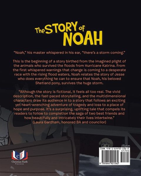 "Noah," his master whispered in his ear, "there's a storm coming." This is the beginning of a story birthed from the imagined plight of the animals who survived the floods from Hurricane Katrina. From the first whispered warnings that change is coming to a desperate race with the rising flood waters, Noah relates the story of Jesse who does everything he can to ensure that Noah, his beloved Shetland pony, survives the huge storm. "Although the story is fictional, it feels all too real. The vivid description, the fast-paced storytelling, and the multidimensional characters draw its audience in to a story that follows an exciting yet heart-wrenching adventure of tragedy and loss to a place of hope and purpose. It's a surprising, uplifting tale that compels its readers to follow to completion the saga of two best friends and how beautifully and intricately their lives intertwine." (Laura Gardham, honored BA and councilor)