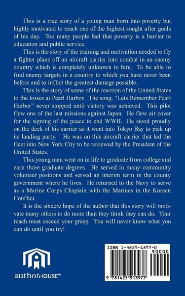 This is a true story of a young man born into poverty but highly motivated to reach one of the highest sought after goals of his day. Too many people feel that poverty is a barrier to education and public service. This is the story of the training and motivation needed to fly a fighter plane off an aircraft carrier into combat in an enemy country which is completely unknown to him. To be able to find enemy targets in a country to which you have never been before and to inflict the greatest damage possible. This is the story of some of the reaction of the United States to the losses at Pearl Harbor. The song, "Lets Remember Pearl Harbor" never stopped until victory was achieved. This pilot flew one of the last missions against Japan. He flew air cover for the signing of the peace to end WWII. He stood proudly on the deck of his carrier as it went into Tokyo Bay to pick up its landing party. He was on this aircraft carrier that led the fleet into New York City to be reviewed by the President of the United States. This young man went on in life to graduate from college and earn three graduate degrees. He served in many community volunteer positions and served an interim term in the county government where he lives. He returned to the Navy to serve as a Marine Corps Chaplain with the Marines in the Korean Conflict. It is the sincere hope of the author that this story will motivate many others to do more than they think they can do. Your reach must exceed your grasp. You will never know what you can do until you try!