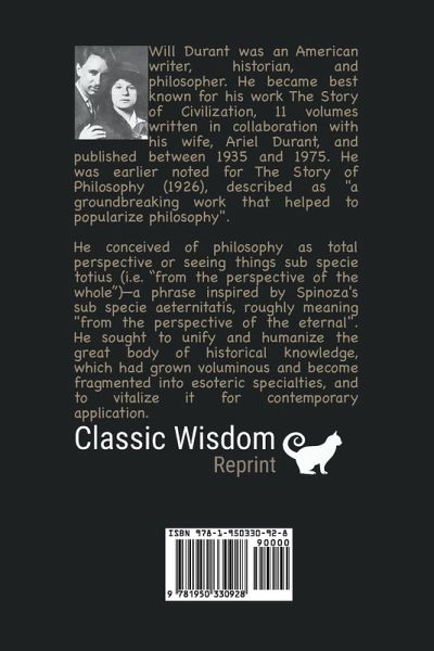 The Story of Philosophy: The Lives and Opinions of the Greater Philosophers is a 1926 book by Will Durant, in which he profiles several prominent Western philosophers and their ideas, beginning with Socrates and Plato and on through Friedrich Nietzsche. Durant attempts to show the interconnection of their ideas and how one philosopher's ideas informed the next. There are nine chapters each focused on one philosopher, and two more chapters each containing briefer profiles of three early 20th century philosophers. The book was published in 1926, with a revised second edition released in 1933. The work was preceded by a number of pamphlets in the Little Blue Books series of inexpensive worker education pamphlets. They proved so popular they were assembled into a single book and published in hardcover form by Simon & Schuster in 1926. Philosophers profiled are, in order: Plato (with a section on Socrates), Aristotle, Francis Bacon, Baruch Spinoza (with a section on Descartes), Voltaire (with a section on Rousseau), Immanuel Kant (with a section on Hegel), Arthur Schopenhauer, Herbert Spencer, and Friedrich Nietzsche. The final two chapters are devoted to European and then American philosophers. Henri Bergson, Benedetto Croce, and Bertrand Russell are covered in the tenth, and George Santayana, William James, and John Dewey are covered in the eleventh.