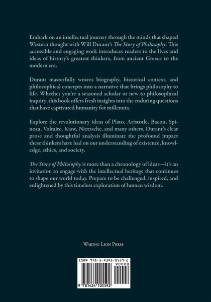 Embark on an intellectual journey through the minds that shaped Western thought with Will Durant's The Story of Philosophy. This accessible and engaging work introduces readers to the lives and ideas of history's greatest thinkers, from ancient Greece to the modern era. Durant masterfully weaves biography, historical context, and philosophical concepts into a narrative that brings philosophy to life. Whether you're a seasoned scholar or new to philosophical inquiry, this book offers fresh insights into the enduring questions that have captivated humanity for millennia. Explore the revolutionary ideas of Plato, Aristotle, Bacon, Spinoza, Voltaire, Kant, Nietzsche, and many others. Durant's clear prose and thoughtful analysis illuminate the profound impact these thinkers have had on our understanding of existence, knowledge, ethics, and society. The Story of Philosophy is more than a chronology of ideas-it's an invitation to engage with the intellectual heritage that continues to shape our world today. Prepare to be challenged, inspired, and enlightened by this timeless exploration of human wisdom.