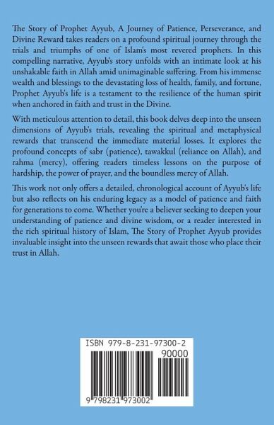 The Story of Prophet Ayyub, A Journey of Patience, Perseverance, and Divine Reward takes readers on a profound spiritual journey through the trials and triumphs of one of Islam's most revered prophets. In this compelling narrative, Ayyub's story unfolds with an intimate look at his unshakable faith in Allah amid unimaginable suffering. From his immense wealth and blessings to the devastating loss of health, family, and fortune, Prophet Ayyub's life is a testament to the resilience of the human spirit when anchored in faith and trust in the Divine. With meticulous attention to detail, this book delves deep into the unseen dimensions of Ayyub's trials, revealing the spiritual and metaphysical rewards that transcend the immediate material losses. It explores the profound concepts of sabr (patience), tawakkul (reliance on Allah), and rahma (mercy), offering readers timeless lessons on the purpose of hardship, the power of prayer, and the boundless mercy of Allah. This work not only offers a detailed, chronological account of Ayyub's life but also reflects on his enduring legacy as a model of patience and faith for generations to come. Whether you're a believer seeking to deepen your understanding of patience and divine wisdom, or a reader interested in the rich spiritual history of Islam, The Story of Prophet Ayyub provides invaluable insight into the unseen rewards that await those who place their trust in Allah.