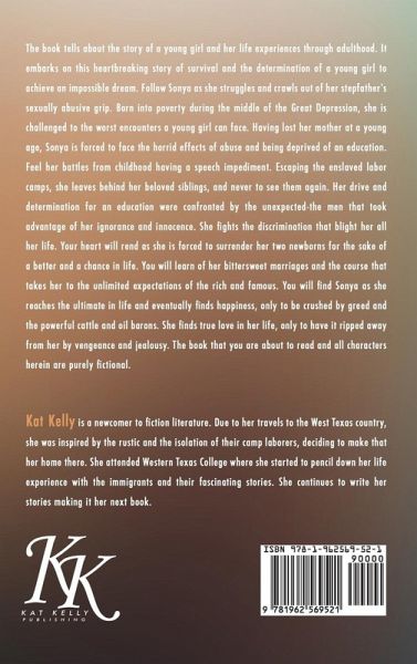 The span of sixty years is the life story of a young girl and the sacrifices she had to make to achieve her goals. The book tells about the story of a young girl and her life experiences through adulthood. It embarks on this heartbreaking story of survival and the determination of a young girl to achieve an impossible dream. Follow Sonya as she struggles and crawls out of her stepfather's sexually abusive grip. Born into poverty during the middle of the Great Depression, she is challenged to the worst encounters a young girl can face. Having lost her mother at a young age, Sonya is forced to face the horrid effects of abuse and being deprived of an education. Feel her battles from childhood having a speech impediment. Escaping the enslaved labor camps, she leaves behind her beloved siblings, and never to see them again. Her drive and determination for an education were confronted by the unexpected-the men that took advantage of her ignorance and innocence. She fights the discrimination that blight her all her life. Your heart will rend as she is forced to surrender her two newborns for the sake of a better and a chance in life. You will learn of her bittersweet marriages and the course that takes her to the unlimited expectations of the rich and famous. You will find Sonya as she reaches the ultimate in life and eventually finds happiness, only to be crushed by greed and the powerful cattle and oil barons. She finds true love in her life, only to have it ripped away from her by vengeance and jealousy. The book that you are about to read and all characters herein are purely fictional.