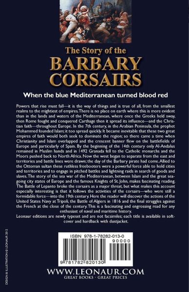 When the blue Mediterranean turned blood red Powers that rise must fall-it is the way of things and is true of all, from the smallest realms to the mightiest of empires. There is no place on earth where this is more evident than in the lands and waters of the Mediterranean, where once the Greeks held sway, then Rome fought and conquered Carthage as it spread its influence-and the Christian faith-throughout Europe. In the 7th century, in the Arabian Peninsula, the prophet Mohammed founded Islam; it too spread quickly. It became inevitable that these two great empires of faith would both seek to dominate the region; so there came a time when Christianity and Islam overlapped and the crescent banner flew on the battlefields of Europe and particularly of Spain. By the beginning of the 14th century only Al-Andalus remained in Muslim hands and in 1492 Granada fell to the Catholic monarchs and the Moors pushed back to North Africa. Now the west began to separate from the east and territories and battle lines were drawn; the day of the Barbary pirate had come. Allied to the Ottoman sultan these ruthless freebooters were a powerful force able to hold cities and territories and to engage in pitched battles and lightning raids in search of goods and slaves. The story of the sea war of the Mediterranean, between Islam and the great sea-going city states of Europe and the famous Knights of St. John, makes fascinating reading. The Battle of Lepanto broke the corsairs as a major threat, but what makes this account especially interesting is that it follows the activities of the corsairs-who were still a formidable force-into the 19th century. Here the reader will discover the actions of the United States Navy at Tripoli, the Battle of Algiers in 1816 and the final struggles against the French at the close of the century. This is a fascinating and engrossing read for any enthusiast of naval and maritime history. Leonaur editions are newly typeset and are not facsimiles; each title is available in softcover and hardback with dustjacket.