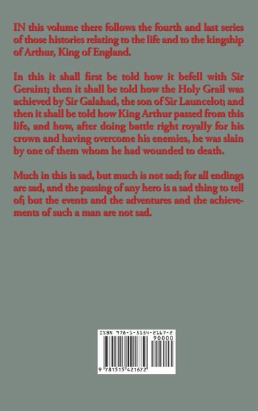 IN this volume there follows the fourth and last series of those histories relating to the life and to the kingship of Arthur, King of England. In this it shall first be told how it befell with Sir Geraint; then it shall be told how the Holy Grail was achieved by Sir Galahad, the son of Sir Launcelot; and then it shall be told how King Arthur passed from this life, and how, after doing battle right royally for his crown and having overcome his enemies, he was slain.