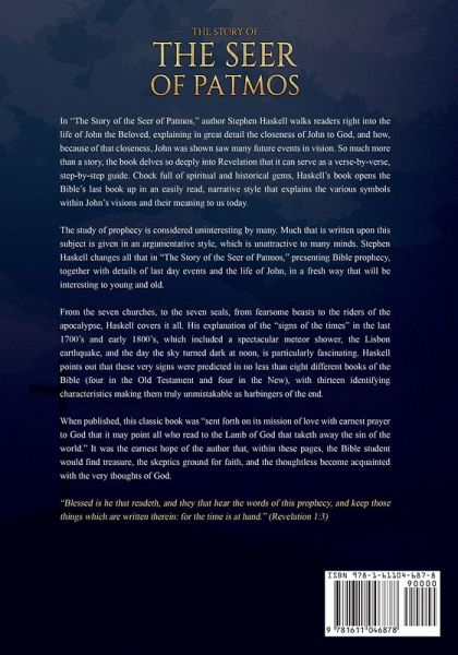 In "The Story of the Seer of Patmos," author Stephen Haskell walks readers right into the life of John the Beloved, explaining in great detail the closeness of John to God, and how, because of that closeness, John was shown many future events in vision. So much more than a story, the book delves so deeply into Revelation that it can serve as a verse-by-verse, step-by-step guide. Chock full of spiritual and historical gems, Haskell's book opens the Bible's last book up in an easily read, narrative style that explains the various symbols within John's visions and their meaning to us today. The study of prophecy is considered uninteresting by many. Much that is written upon this subject is given in an argumentative style, which is unattractive to many minds. Stephen Haskell changes all that in "The Story of the Seer of Patmos," presenting Bible prophecy, together with details of last day events and the life of John, in a fresh way that will be interesting to young and old. From the seven churches, to the seven seals, from fearsome beasts to the riders of the apocalypse, Haskell covers it all. His explanation of the "signs of the times" in the last 1700's and early 1800's, which included a spectacular meteor shower, the Lisbon earthquake, and the day the sky turned dark at noon, is particularly fascinating. Haskell points out that these very signs were predicted in no less than eight different books of the Bible (four in the Old Testament and four in the New), with thirteen identifying characteristics making them truly unmistakable as harbingers of the end. When published, this classic book was "sent forth on its mission of love with earnest prayer to God that it may point all who read to the Lamb of God that taketh away the sin of the world." It was the earnest hope of the author that, within these pages, the Bible student would find treasure, the skeptics ground for faith, and the thoughtless become acquainted with the very thoughts of God. "Blessed is he that readeth, and they that hear the words of this prophecy, and keep those things which are written therein: for the time is at hand." (Revelation 1:3)