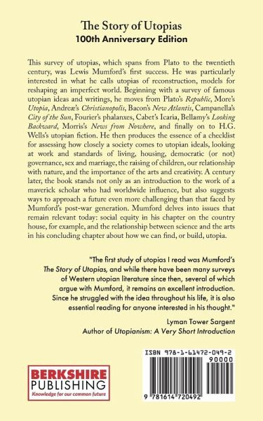 This survey of utopias, which spans from Plato to the twentieth century, was Lewis Mumford's first success. He was particularly interested in what he calls utopias of reconstruction, models for reshaping an imperfect world. Beginning with a survey of famous utopian ideas and writings, he moves from Plato's Republic, More's Utopia, Andreæ's Christianopolis, Bacon's New Atlantis, Campanella's City of the Sun, Fourier's phalanxes, Cabet's Icaria, Bellamy's Looking Backward, Morris's News from Nowhere, and finally on to H.G. Wells's utopian fiction. He then produces the essence of a checklist for assessing how closely a society comes to utopian ideals, looking at work and standards of living, housing, democratic (or not) governance, sex and marriage, the raising of children, our relationship with nature, and the importance of the arts and creativity. A century later, the book stands not only as an introduction to the work of a maverick scholar who had worldwide influence, but also suggests ways to approach a future even more challenging than that faced by Mumford's post-war generation. Mumford delves into issues that remain relevant today: social equity in his chapter on the country house, for example, and the relationship between science and the arts in his concluding chapter about how we can find, or build, utopia. Mumford was thinking, as many of us are, about the practical lessons offered by imagined utopias. He posits that there are utopias of escape and utopias of "reconstruction," and was particularly interested in these utopias of reconstruction, models for reshaping an imperfect world: The utopia of reconstruction is what its name implies: a vision of a reconstituted environment which is better adapted to the nature and aims of the human beings who dwell within it than the actual one; and not merely better adapted to their actual nature, but better fitted to their possible developments. If the first utopia [of escape] leads backward into the utopian's ego, the second leads outward-outward into the world. In contrast with The Waste Land by T. S. Eliot, also published in 1922 by Boni & Liveright and republished by Berkshire Publishing Group in 2022, The Story of Utopias is largely about this idea of reconstruction, rather than the disillusion that Eliot's poem so powerfully captures.