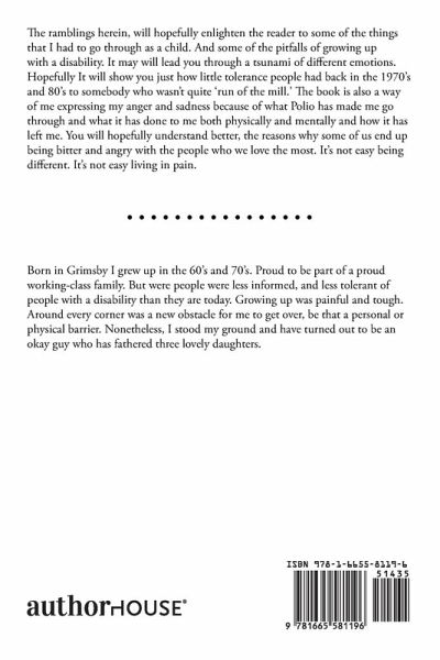 The ramblings herein, will hopefully enlighten the reader to some of the things that I had to go through as a child. And some of the pitfalls of growing up with a disability. It may will lead you through a tsunami of different emotions. Hopefully It will show you just how little tolerance people had back in the 1970's and 80's to somebody who wasn't quite 'run of the mill.' The book is also a way of me expressing my anger and sadness because of what Polio has made me go through and what it has done to me both physically and mentally and how it has left me. You will hopefully understand better, the reasons why some of us end up being bitter and angry with the people who we love the most. It's not easy being different. It's not easy living in pain.