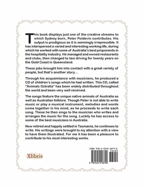 This book displays just one of the creative streams to which Sydney born, Peter Poidevin contributes. His output is prodigious as it is seemingly irrepressible. It has interspersed a varied and interesting working life, during which he worked with some of Australia’s best proponents in the hospitality industry. He managed and owned restaurants and clubs, then changed to taxi driving for twenty years on the Gold Coast in Queensland. These jobs brought him into contact with a great variety of people, but that’s another story… Through his acquaintance with musicians, he produced a CD of children’s songs which he had written. This CD, called "Animals Oztralia" has been widely distributed throughout the world and been very well received. The songs feature the unique native animals of Australia as well as Australian folklore. Though Peter is not able to write music or play a musical instrument, melodies and words come together in his mind, as he proceeds to write each song. These he then sings to the musician who writes and arranges the music for the song. Luckily he has access to some of the best musicians in Australia. Now retired and happily settled in Tasmania, he continues to write. His writings were brought to my attention with a view to have them illustrated. For me it has been a pleasure to contribute to his most interesting works.