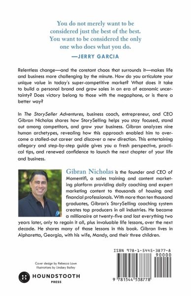 You do not merely want to be considered just the best of the best. You want to be considered the only one who does what you do.-Jerry Garcia Relentless change-and the constant chaos that surrounds it-makes life and business more challenging by the minute. How do you articulate your unique value in today's super-competitive market? What does it take to build a personal brand and grow sales in an era of economic uncertainty? Does victory belong to those with the megaphone, or is there a better way? In The StorySeller Adventures, business coach, entrepreneur, and CEO Gibran Nicholas shares how StorySelling helps you stay focused, stand out among competitors, and grow your business. Gibran analyzes nine human archetypes, revealing how this approach enabled him to overcome a stalled-out career and discover a new direction. This entertaining allegory and step-by-step guide gives you a fresh perspective, practical tips, and renewed confidence to launch the next chapter of your life and business.