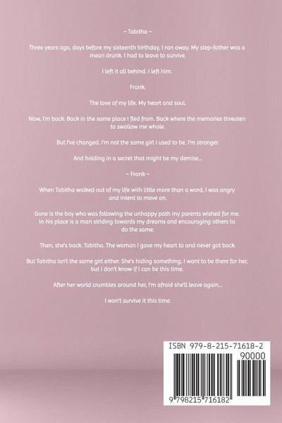 ~ Tabitha ~ Three years ago, days before my sixteenth birthday, I ran away. My step-father was a mean drunk, I had to leave to survive. I left it all behind, including him. Frank. The love of my life. My heart and soul. Now, I'm back. Back in the same place I fled from. Back where the memories threaten to swallow me whole. But I've changed. I'm not the same girl I used to be. I'm stronger. And holding in a secret that might be my demise... ~ Frank ~ When Tabitha walked out of my life with little more than a word, I was angry and intent to move on. Gone is the boy who was following the unhappy path my parents wished for me. In his place is a man striding towards his dreams and encouraging others to do the same. Then, she's back. Tabitha. The woman I gave my heart to and never got back. But Tabitha isn't the same girl either. She's hiding something. I want to be there for her, but I don't know if I can be this time. After her world crumbles around her, I'm afraid she'll leave again... I won't survive it this time.