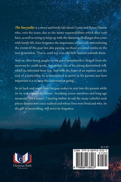 The Storyteller is a sweet and lovely tale about Curtis and Penny Hansin who, over the years, due to the many responsibilities which they now have, as well as trying to keep up with the daunting challenges that come with family life, have forgotten the importance of not only remembering the events of the past but also passing on those ancestral stories to the next generation. That is, until ten-year-old little Samuel reminds them. And so, after being taught by his great-grandmother Abigail from the moment he could speak, Sam makes use of his strong determined will, which he inherited from her. And with the heart of an explorer and the soul of a storyteller, he is determined to prove to his parents just how important it is to keep the conversation going. So sit back and watch how the past makes its way into the present while on its way toward the future. Streaking across timelines and long-ago memories like a comet. Carrying within its tail the many colorful souls whose dreams were once realized and whose lives were lived and who, by the gift of storytelling, will never be forgotten.