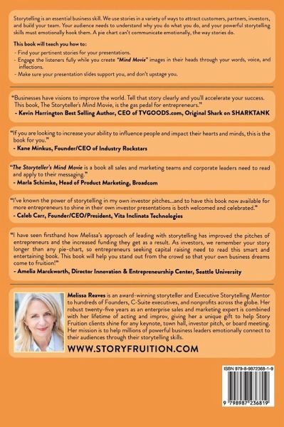Storytelling is an essential business skill. We use stories in a variety of ways to attract customers, partners, investors, and build your team. Your audience needs to understand why you do what you do, and your powerful storytelling skills must emotionally hook them. A pie chart can't communicate emotionally, the way stories do. This book will teach you how to: Find your pertinent stories for keynotes, town halls, sales and investor presentations, fundraising and recruitment interviews, as well as media appearances. Craft your stories to stop the meander. Put your listeners in a "Mind Movie" so that they see it, taste it, smell it, touch it, and most of all, feel it---so that your leadership becomes magnetic, memorable, and impactful to drive the results you seek. Transform your verbal presentation slides so that they support you, and don't usurp you with too much information. As Steve Jobs said, "The most powerful person in the world is the storyteller. The storyteller sets the vision, values, and agenda of an entire generation that is to come." And, I'll add that as the presenter or storyteller, you have the obligation to educate, empower, inspire, motivate, and entertain. That's where refined storytelling skills come into play. Your business mission, vision, and work depend on the connections you make with others. Your stories matter, so tell them well!