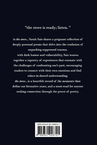 in the stove., Sarah Sais shares a poignant collection of deeply personal poems that delve into the confusion of unpacking suppressed trauma. with dark humor and vulnerability, Sais weaves together a tapestry of experiences that resonate with the challenges of confronting one's past, encouraging readers to connect with their own emotions and find solace in shared understanding. the stove., is a heartfelt record of the moments that define our formative years, and a must-read for anyone seeking connection through the power of poetry.