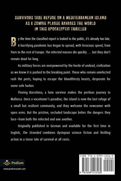 Survivors take refuge on a Mediterranean island as a zombie plague ravages the world in this apocalyptic thriller-available for the first time in English. By the time the classified report is leaked to the public, it's already too late. A horrifying pandemic has begun to spread, with ferocious speed, from Paris to the rest of Europe. The infected masses die quickly . . . but they don't remain dead for long. As military forces are overpowered by the horde of undead, civilization as we know it is pushed to the breaking point. Those who remain uninfected rush the ports, hoping to escape the bloodthirsty beasts, desperate for some safe harbor. Fleeing Barcelona, a lone survivor makes the perilous journey to Mallorca. Once a vacationer's paradise, the island is now the last refuge of a small but resilient community, and they welcome the newcomer with open arms. But the pristine, secluded landscape belies the dangers they face-from both the infected and one another. Originally published in German and available for the first time in English, The Stranded combines dystopian science fiction and thrilling action in a tense tale of survival at all costs.