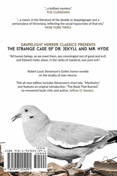 This is the edition you need! Volume 1 in Gravelight Press' ambitious thirteen-volume classic horror series (Gravelight Horror Classics) presents The Strange Case of Dr. Jekyll and Mr. Hyde by Robert Louis Stevenson. This all-new edition includes Stevenson's short story, "Markheim," offering readers a second tale of duality by the author. Also features an all-new 4,000-word introduction and essay, "The Book That Burned" by acclaimed book critic and author, Jeffrey D. Keeten. Keeten's research provides keen insights and explains why Stevenson's classic tale of terror was nearly lost to the world forever.