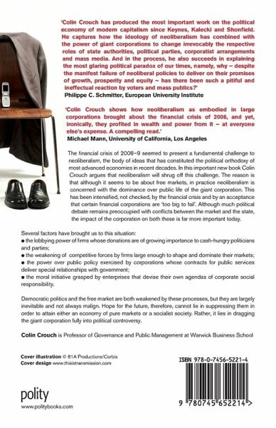 The financial crisis seemed to present a fundamental challenge to neo liberalism, the body of ideas that have constituted the political orthodoxy of most advanced economies in recent decades. Colin Crouch argues in this book that it will shrug off this challenge. The reason is that while neo liberalism seems to be about free markets, in practice it is concerned with the dominance over public life of the giant corporation. This has been intensified, not checked, by the recent financial crisis and acceptance that certain financial corporations are 'too big to fail'. Although much political debate remains preoccupied with conflicts between the market and the state, the impact of the corporation on both these is today far more important.