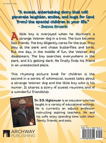 A little boy is overjoyed when he discovers a strange Weiner dog in a tree. The two become fast friends. The boy diligently cares for the pup. They play at the park and chase butterflies and birds. But one day, in the middle of fun, the Weiner dog disappears. The boy searches everywhere in the park, and it's getting dark. He finally finds his friend in an unexpected place. This rhyming picture book for children is the second in a series of whimsical, sweet tales about a strange Weiner dog and the little boy who is his owner. It shares a story of sweet reunions and of a wonderful friendship.