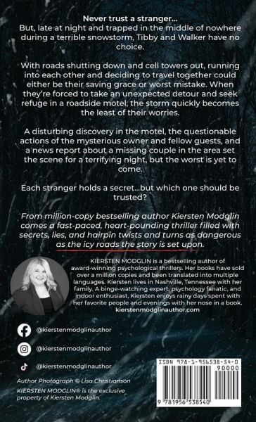 Never trust a stranger... But, late at night and trapped in the middle of nowhere during a terrible snowstorm, Tibby and Walker have no choice. With roads shutting down and cell towers out, running into each other and deciding to travel together could either be their saving grace or worst mistake. When they're forced to take an unexpected detour and seek refuge in a roadside motel, the storm quickly becomes the least of their worries. A disturbing discovery in the motel, the questionable actions of the mysterious owner and fellow guests, and a news report about a missing couple in the area set the scene for a terrifying night, but the worst is yet to come. Each stranger holds a secret...but which one should be trusted? From million-copy bestselling author Kiersten Modglin comes a fast-paced, heart-pounding thriller filled with secrets, lies, and hairpin twists and turns as dangerous as the icy roads the story is set upon.