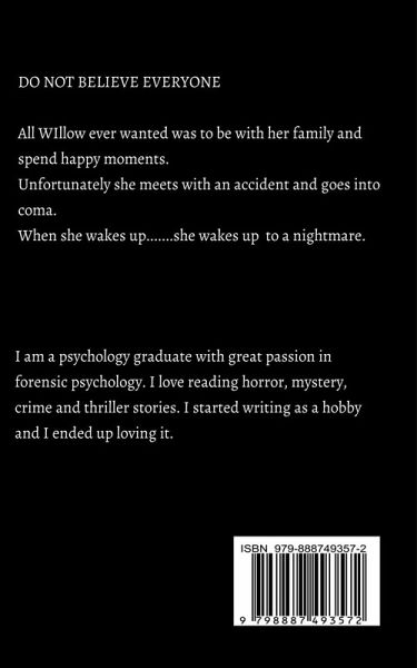 Welcome to my nightmare! Do not believe everyone All Willow ever wanted, was to be with her family and spend happy moments. Unfortunately, Willow meets with an accident and falls into a coma. WHen she wakes up.....she wakes up to a nightmare.