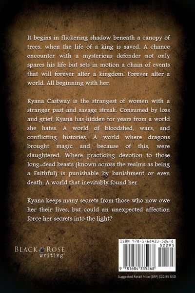 It begins in flickering shadow beneath a canopy of trees, when the life of a king is saved. A chance encounter with a mysterious defender not only spares his life but sets in motion a chain of events that will forever alter a kingdom. Forever alter a world. All beginning with her. Kyana Castway is the strangest of women with a stranger past and savage streak. Consumed by loss and grief, Kyana has hidden for years from a world she hates. A world of bloodshed, wars, and conflicting histories. A world where dragons brought magic and because of this, were slaughtered. Where practicing devotion to those long-dead beasts (known across the realms as being a Faithful) is punishable by banishment or even death. A world that inevitably found her. Kyana keeps many secrets from those who now owe her their lives, but could an unexpected affection force her secrets into the light?