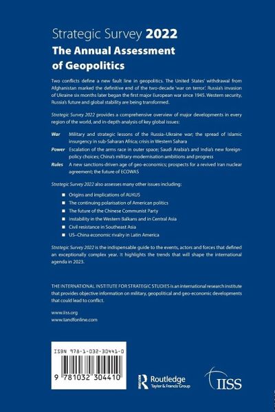 Strategic Survey 2022: The Annual Assessment of Geopolitics provides objective, in-depth analysis of the events that have shaped relations between major powers, region by region, over the past year, and highlights the pressing geopolitical and geo-economic challenges that will shape the international agenda in 2023. It features essays on global issues such as Russia's war in Ukraine, the arms race in space and the deepening US-China rivalry, as well as in-depth analysis of the major themes shaping each continent. Specially commissioned maps and graphics illustrate major arguments, and multi-source data illuminates longer-term trends in power relations.
