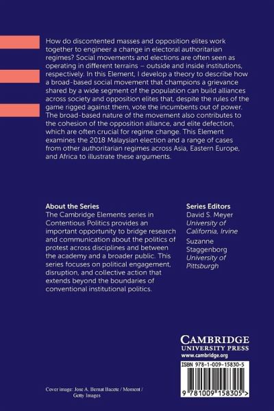 How do discontented masses and opposition elites work together to engineer a change in electoral authoritarian regimes? Social movements and elections are often seen as operating in different terrains ¿ outside and inside institutions, respectively. In this Element, I develop a theory to describe how a broad-based social movement that champions a grievance shared by a wide segment of the population can build alliances across society and opposition elites that, despite the rules of the game rigged against them, vote the incumbents out of power. The broad-based nature of the movement also contributes to the cohesion of the opposition alliance, and elite defection, which are often crucial for regime change. This Element examines the 2018 Malaysian election and a range of cases from other authoritarian regimes across Asia, Eastern Europe, and Africa to illustrate these arguments.