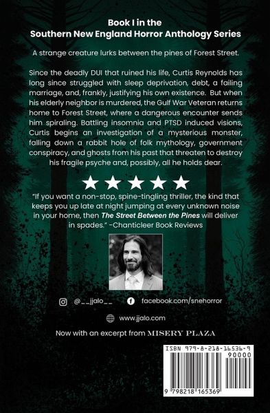 This debut psychological thriller by award-winning author J.J. Alo will scratch readers' horror itch like the writing of H.P. Lovecraft or modern-day master Stephen King. A strange creature lurks between the pines of Forest Street. Since the deadly DUI that ruined his life, Curtis Reynolds has long since struggled with sleep deprivation, debt, a failing marriage, and, frankly, justifying his own existence. But when his elderly neighbor is murdered, the Gulf War Veteran returns home to Forest Street, where a dangerous encounter sends him spiraling. Battling insomnia and PTSD induced visions, Curtis begins an investigation of a mysterious monster, falling down a rabbit hole of folk mythology, government conspiracy, and ghosts from his past that threaten to destroy his fragile psyche and, possibly, all he holds dear. 2024 President's Book Award Winner - Florida Authors & Publishers Association 2024 BREW Readers' Choice Book Award Finalist 2023 Chanticleer Int'l Book Awards (CIBA) Winner "Alo's adept ability to intertwine multiple threads of tension keeps the intensity impressively high throughout, weaving a thick tapestry of terror." - Kirkus Reviews