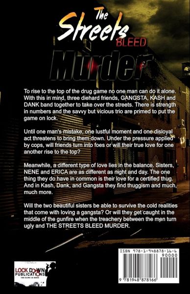 To rise to the top of the drug game no one man can do it alone. With this in mind, three diehard friends, GANGSTA, KASH and DANK band together to take over the streets. There is strength in numbers and the savvy but vicious trio are primed to put the game on lock. Until one man's mistake, one lustful moment and one disloyal act threatens to bring them down. Under the pressure applied by cops, will friends turn into foes or will their true love for one another rise to the top? Meanwhile, a different type of love lies in the balance. Sisters, NENE and ERICA are as different as night and day. The one thing they do have in common is their love for a certified thug. And in Kash, Dank, and Gangsta they find thuggism and much, much more. Will the two beautiful sisters be able to survive the cold realities that come with loving a gangsta? Or will they get caught in the middle of the gunfire when the treachery between the men turn ugly and THE STREETS BLEED MURDER.