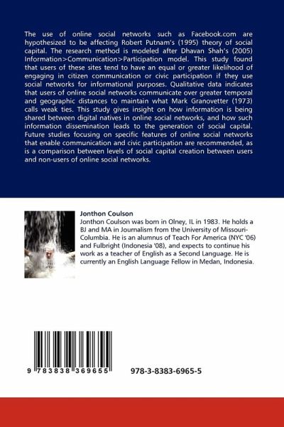 The use of online social networks such as Facebook.com are hypothesized to be affecting Robert Putnam s (1995) theory of social capital. The research method is modeled after Dhavan Shah s (2005) InformationCommunicationParticipation model. This study found that users of these sites tend to have an equal or greater likelihood of engaging in citizen communication or civic participation if they use social networks for informational purposes. Qualitative data indicates that users of online social networks communicate over greater temporal and geographic distances to maintain what Mark Granovetter (1973) calls weak ties. This study gives insight on how information is being shared between digital natives in online social networks, and how such information dissemination leads to the generation of social capital. Future studies focusing on specific features of online social networks that enable communication and civic participation are recommended, as is a comparison between levels of social capital creation between users and non-users of online social networks.