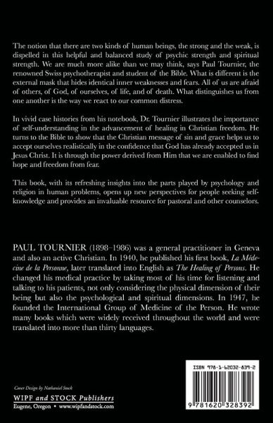 The notion that there are two kinds of human beings, the strong and the weak, is dispelled in this helpful and balanced study of psychic strength and spiritual strength. We are much more alike than we may think, says Paul Tournier, the renowned Swiss psychotherapist and student of the Bible. What is different is the external mask that hides identical inner weaknesses and fears. All of us are afraid of others, of God, of ourselves, of life, and of death. What distinguishes us from one another is the way we react to our common distress. In vivid case histories from his notebook, Dr. Tournier illustrates the importance of self understanding in the advancement of healing in Christian freedom. He turns to the Bible to show that the Christian message of sin and grace helps us to accept ourselves realistically in the confidence that God has already accepted us in Jesus Christ. It is through the power derived from Him that we are enabled to find hope and freedom from fear. This book, with its refreshing insights into the parts played by psychology and religion in human problems, opens up new perspectives for people seeking self knowledge and provides an invaluable resource for pastoral and other counselors.