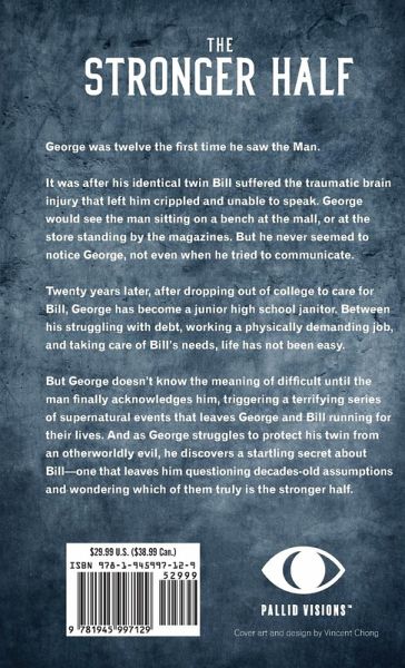 George was twelve the first time he saw the Man. It was after his identical twin Bill suffered the traumatic brain injury that left him crippled and unable to speak. George would see the man sitting on a bench at the mall, or at the store standing by the magazines. But he never seemed to notice George, not even when he tried to communicate. Twenty years later, after dropping out of college to care for Bill, George has become a junior high school janitor. Between his struggling with debt, working a physically demanding job, and taking care of Bill’s needs, life has not been easy. But George doesn’t know the meaning of difficult until the man finally acknowledges him, triggering a terrifying series of supernatural events that leaves George and Bill running for their lives. And as George struggles to protect his twin from an otherworldly evil, he discovers a startling secret about Bill—one that leaves him questioning decades-old assumptions and wondering which of them truly is the stronger half.