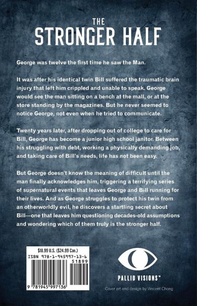 George was twelve the first time he saw the Man. It was after his identical twin Bill suffered the traumatic brain injury that left him crippled and unable to speak. George would see the man sitting on a bench at the mall, or at the store standing by the magazines. But he never seemed to notice George, not even when he tried to communicate. Twenty years later, after dropping out of college to care for Bill, George has become a junior high school janitor. Between his struggling with debt, working a physically demanding job, and taking care of Bill’s needs, life has not been easy. But George doesn’t know the meaning of difficult until the man finally acknowledges him, triggering a terrifying series of supernatural events that leaves George and Bill running for their lives. And as George struggles to protect his twin from an otherworldly evil, he discovers a startling secret about Bill—one that leaves him questioning decades-old assumptions and wondering which of them truly is the stronger half.