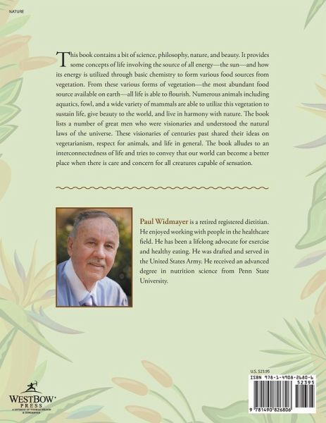 This book contains a bit of science, philosophy, nature, and beauty. It provides some concepts of life involving the source of all energy-the sun-and how its energy is utilized through basic chemistry to form various food sources from vegetation. From these various forms of vegetation-the most abundant food source available on earth-all life is able to flourish. Numerous animals including aquatics, fowl, and a wide variety of mammals are able to utilize this vegetation to sustain life, give beauty to the world, and live in harmony with nature. The book lists a number of great men who were visionaries and understood the natural laws of the universe. These visionaries of centuries past shared their ideas on vegetarianism, respect for animals, and life in general. The book alludes to an interconnectedness of life and tries to convey that our world can become a better place when there is care and concern for all creatures capable of sensation.