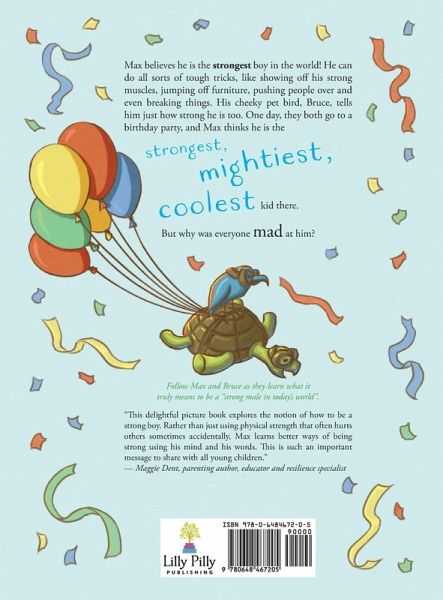 Max believes he is the strongest boy in the world. He can do all sorts of tough tricks, like showing off his strong muscles, jumping off the furniture, pushing people over and even breaking things. His cheeky pet bird, Bruce tells him just how strong he is too. One day, they both go to a birthday party and Max thinks he is the strongest, mightiest, coolest kid there. But why was everyone mad at him? The Strongest Boy redefines what it means to be strong in a subtle,yet engaging way for young readers. Follow Max and Bruce as they learn what it truly means to be a "strong male in today's world". This book is a recipient of a Book Excellence Award in the Preschool Category.