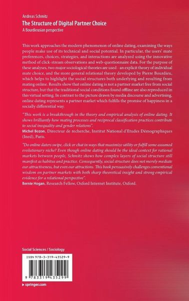 This work approaches the modern phenomenon of online dating, examining the ways people make use of its technical and social potential. In particular, the users' mate preferences, choices, strategies, and interactions are analyzed using the innovative method of click-stream observations and web-questionnaire data. For the purpose of these analyses, two major theories are used - an explicit theory of individual mate choice, and the more general relational theory developed by Pierre Bourdieu, which helps to highlight the social structures both underlying and resulting from mating online. Results show that online dating is not a partner marker free from social structure, but that the traditional social conditions found offline are also reproduced in this virtual setting. In contrast to the picture drawn by media discourse and advertising, online dating represents a partner market which fulfills the promise of happiness in a socially differential way.