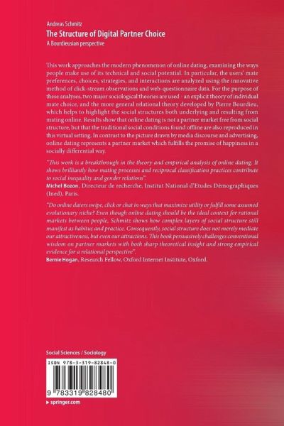 This work approaches the modern phenomenon of online dating, examining the ways people make use of its technical and social potential. In particular, the users' mate preferences, choices, strategies, and interactions are analyzed using the innovative method of click-stream observations and web-questionnaire data. For the purpose of these analyses, two major theories are used - an explicit theory of individual mate choice, and the more general relational theory developed by Pierre Bourdieu, which helps to highlight the social structures both underlying and resulting from mating online. Results show that online dating is not a partner marker free from social structure, but that the traditional social conditions found offline are also reproduced in this virtual setting. In contrast to the picture drawn by media discourse and advertising, online dating represents a partner market which fulfills the promise of happiness in a socially differential way.