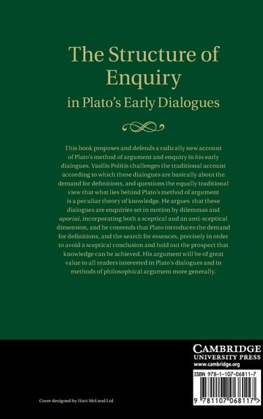 This book proposes and defends a radically new account of Plato's method of argument and enquiry in his early dialogues. Vasilis Politis challenges the traditional account according to which these dialogues are basically about the demand for definitions, and questions the equally traditional view that what lies behind Plato's method of argument is a peculiar theory of knowledge. He argues that these dialogues are enquiries set in motion by dilemmas and aporiai, incorporating both a sceptical and an anti-sceptical dimension, and he contends that Plato introduces the demand for definitions, and the search for essences, precisely in order to avoid a sceptical conclusion and hold out the prospect that knowledge can be achieved. His argument will be of great value to all readers interested in Plato's dialogues and in methods of philosophical argument more generally.