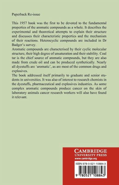 This 1954 book was the first to be devoted to the fundamental properties of the aromatic compounds as a whole. It describes the experimental and theoretical attempts to explain their structure and discusses their characteristic properties and the mechanism of their reactions. Heterocyclic compounds are included in Dr Badger's survey. Aromatic compounds are characterised by their cyclic molecular structure, their high degree of unsaturation and their stability. Coal tar is the chief source of aromatic compounds, but they are also made from crude oil and can be produced synthetically. Nearly all dyestuffs are 'aromatic', as are most of the common drugs and explosives. The book addressed itself primarily to graduates and final-year undergraduates. It was also of interest to research chemists in the dyestuffs, pharmaceutical and explosives industries. As some complex aromatic compounds produce cancer on the skin of laboratory animals, cancer research workers will also have found it relevant.