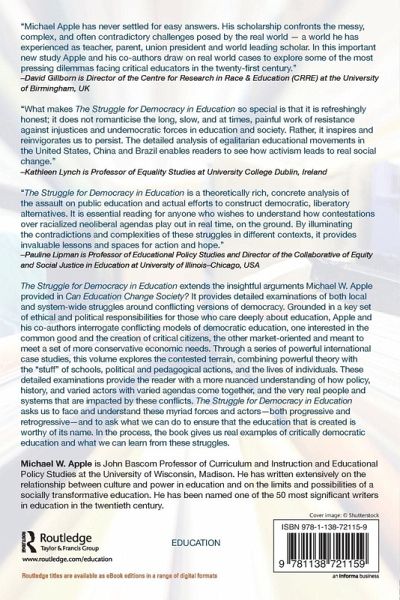 The Struggle for Democracy in Education extends the insightful arguments Michael W. Apple provided in Can Education Change Society? It provides detailed examinations of both local and system-wide struggles around conflicting versions of democracy. Grounded in a key set of ethical and political responsibilities for those who care deeply about education, Apple and his co-authors interrogate conflicting models of democratic education, one interested in the common good and the creation of critical citizens, the other market-oriented and meant to meet a set of more conservative economic needs. Through a series of powerful international case studies, this volume explores the contested terrain, combining powerful theory with the "stuff" of schools, political and pedagogical actions, and the lives of individuals. These detailed examinations provide the reader with a more nuanced understanding of how policy, history, and varied actors with varied agendas come together, and the very real people and systems that are impacted by these conflicts. The Struggle for Democracy in Education asks us to face and understand these myriad forces and actors-both progressive and retrogressive-and to ask what we can do to ensure that the education that is created is worthy of its name. In the process, the book gives us real examples of critically democratic education and what we can learn from these struggles.