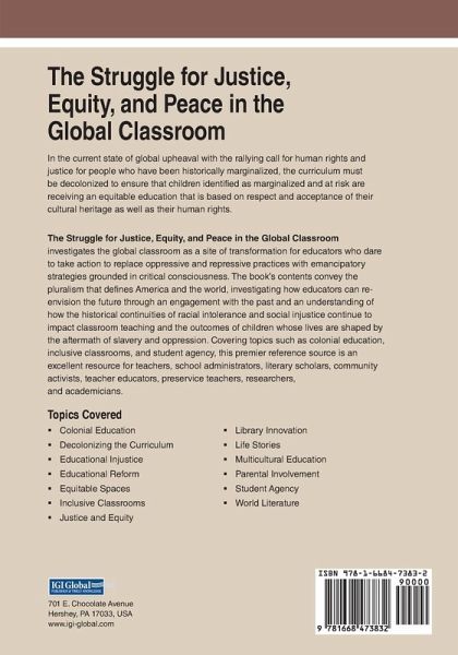 In the current state of global upheaval with the rallying call for human rights and justice for people who have been historically marginalized, the curriculum must be decolonized to ensure that children identified as marginalized and at risk are receiving an equitable education that is based on respect and acceptance of their cultural heritage as well as their human rights. The Struggle for Justice, Equity, and Peace in the Global Classroom investigates the global classroom as a site of transformation for educators who dare to take action to replace oppressive and repressive practices with emancipatory strategies grounded in critical consciousness. The book's contents convey the pluralism that defines America and the world, investigating how educators can re-envision the future through an engagement with the past and an understanding of how the historical continuities of racial intolerance and social injustice continue to impact classroom teaching and the outcomes of children whose lives are shaped by the aftermath of slavery and oppression. Covering topics such as colonial education, inclusive classrooms, and student agency, this premier reference source is an excellent resource for teachers, school administrators, literary scholars, community activists, teacher educators, preservice teachers, researchers, and academicians.