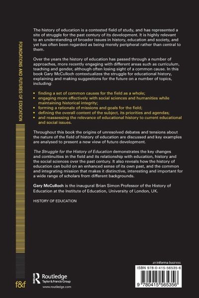The history of education is a contested field of study, and has represented a site of struggle for the past century of its development. It is highly relevant to an understanding of broader issues in history, education and society, and yet has often been regarded as being merely peripheral rather than central to them. Over the years the history of education has passed through a number of approaches, more recently engaging with a different areas such as curriculum, teaching and gender, although often losing sight of a common cause. In this book McCulloch contextualizes the struggle for educational history, explaining and making suggestions for the future on a number of topics, including: finding a set of common causes for the field as a whole engaging more effectively with social sciences and humanities while maintaining historical integrity forming a rationale of missions and goals for the field defining the overall content of the subject, its priorities and agendas and reassessing the relevance of educational history to current educational and social issues. Throughout this book the origins of unresolved debates and tensions about the nature of the field of history of education are discussed and key examples are analysed to present a new view of future development. The Struggle for the History of Education demonstrates the key changes and continuities in the field and its relationship with education, history and the social sciences over the past century. It also reveals how the history of education can build on an enhanced sense of its own past, and the common and integrating mission that makes it distinctive, interesting and important for a wide range of scholars from different backgrounds.