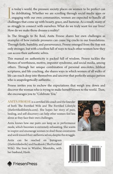 In today's world, the pressure society places on women to be perfect can be debilitating. Whether we are scrolling through social media apps or engaging with our own communities, women are expected to handle all challenges that come up with beauty, grace, and humour. As a result, many of us struggle to connect with ourselves. What do we truly want for our lives? How do we make those dreams a reality? In The Struggle to Be Real, Anita Froese shares her own challenges as examples of how outside pressures can cause big cracks in our foundations. Through faith, humility, and perseverance, Froese emerged from the fray not only stronger, but with a toolbox full of ways to teach other women how they can access their authentic selves. This manual on authenticity is packed full of wisdom. Froese tackles the themes of worthiness, motive, imposter syndrome, and social media, among others. Through her unique combination of personal anecdotes, biblical scriptures, and life coaching, she shares ways in which women of all walks of life can reach deep into themselves and uncover that perfectly unique person who is unapologetically authentic. Froese invites you to eschew the expectations that weigh you down and discover the woman who is trying to make herself known to the world. Then, she encourages you to "Celebrate You."