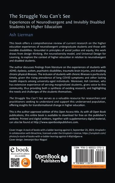 This book offers a comprehensive review of current research on the higher education experiences of neurodivergent undergraduate students and those with invisible disabilities. Grounded in principles of social justice and equity, this work draws from design thinking, the neurodiversity model, and Universal Design for Learning, to explore the context of higher education in relation to neurodivergent and disabled students. The author discusses findings from literature on the experiences of students with ADHD, dyslexia, autism, psychiatric disabilities, traumatic brain injuries, and disabling chronic physical illnesses. The inclusion of students with chronic illnesses is particularly timely, given the rising prevalence of long COVID symptoms and other lasting health impacts among university-aged individuals. Moreover Ash Lierman, who has extensive experience of serving students marginalized students, gives voice to this community, thus providing both a synthesis of existing research, and highlighting the needs and challenges of the students themselves. The Struggle You Can't See serves as a valuable resource for researchers and practitioners seeking to understand and support this underserved population, offering insights for transformational change in higher education.