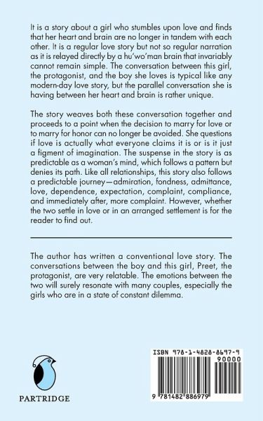 It is a story about a girl who stumbles upon love and finds that her heart and brain are no longer in tandem with each other. It is a regular love story but not so regular narration as it is relayed directly by a hu'wo'man brain that invariably cannot remain simple. The conversation between this girl, the protagonist, and the boy she loves is typical like any modern-day love story, but the parallel conversation she is having between her heart and brain is rather unique. The story weaves both these conversation together and proceeds to a point when the decision to marry for love or to marry for honor can no longer be avoided. She questions if love is actually what everyone claims it is or is it just a figment of imagination. The suspense in the story is as predictable as a woman's mind, which follows a pattern but denies its path. Like all relationships, this story also follows a predictable journey-admiration, fondness, admittance, love, dependence, expectation, complaint, compliance, and immediately after, more complaint. However, whether the two settle in love or in an arranged settlement is for the reader to find out.